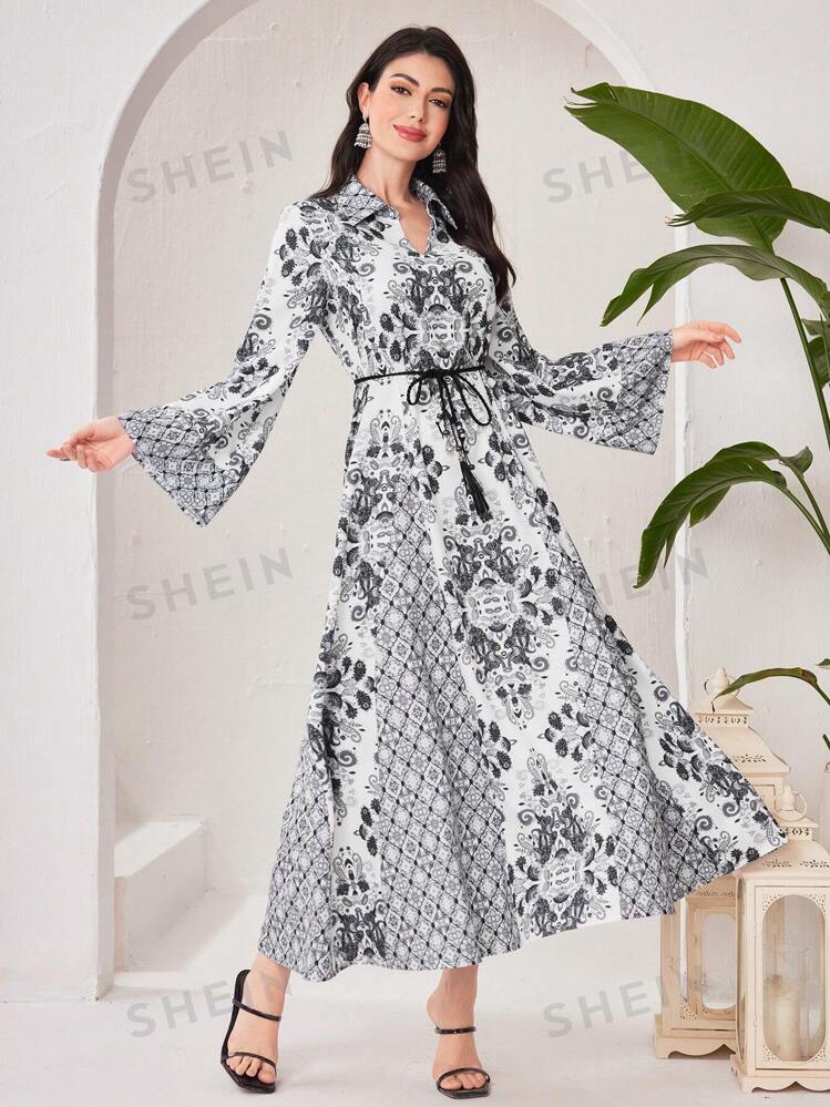 SHEIN Najma All Over Print Belted Flared Sleeves Arabian Dress SHEIN Very well made.