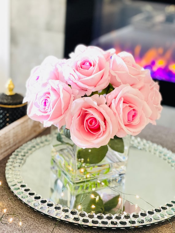 Pink Velvet Roses Arrangement Artificial Faux Centerpiece Natural Touch Flowers in Glass Vase Home Decor Floral Arrangement Blue Paris Etsy Very well made.