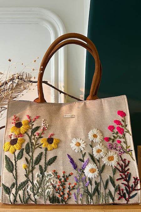 Buy Beige Thread Hand Embroidered Garden Tote Bag by DHAAGA LIFE Online at Aza Fashions Very well made.