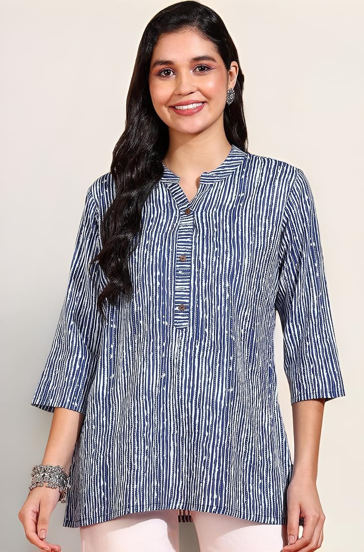 SareeSwarg Rayon Fabric Printed Collar Neck Short Kurtis Top Dresses Kurti for Girls and Womens Navy Blue Amazon.in Fashion Very well made.