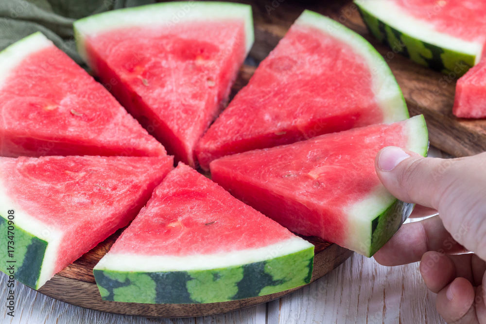 Photo Art Print Woman hand take slice of fresh seedless watermelon cut into triangle shape layin iuliia n Very well made.