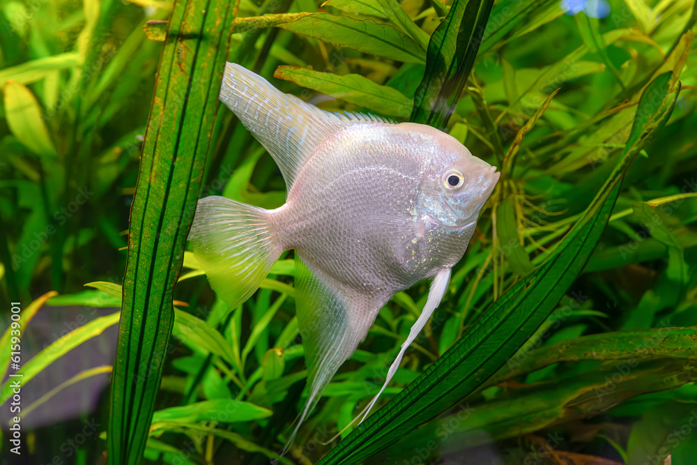 Poster Print Tropical fish Pterophyllum scalare altum angelfish swimming in aquarium water wtih green algae 40x26.7 cm Very well made.