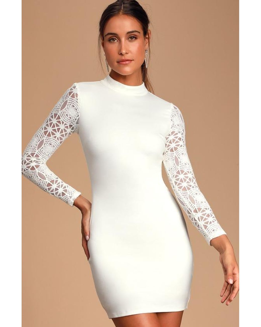 Lulus Lace Up Your Sleeve Lace Long Sleeve Bodycon Dress in Natural Lyst UK Very well made.