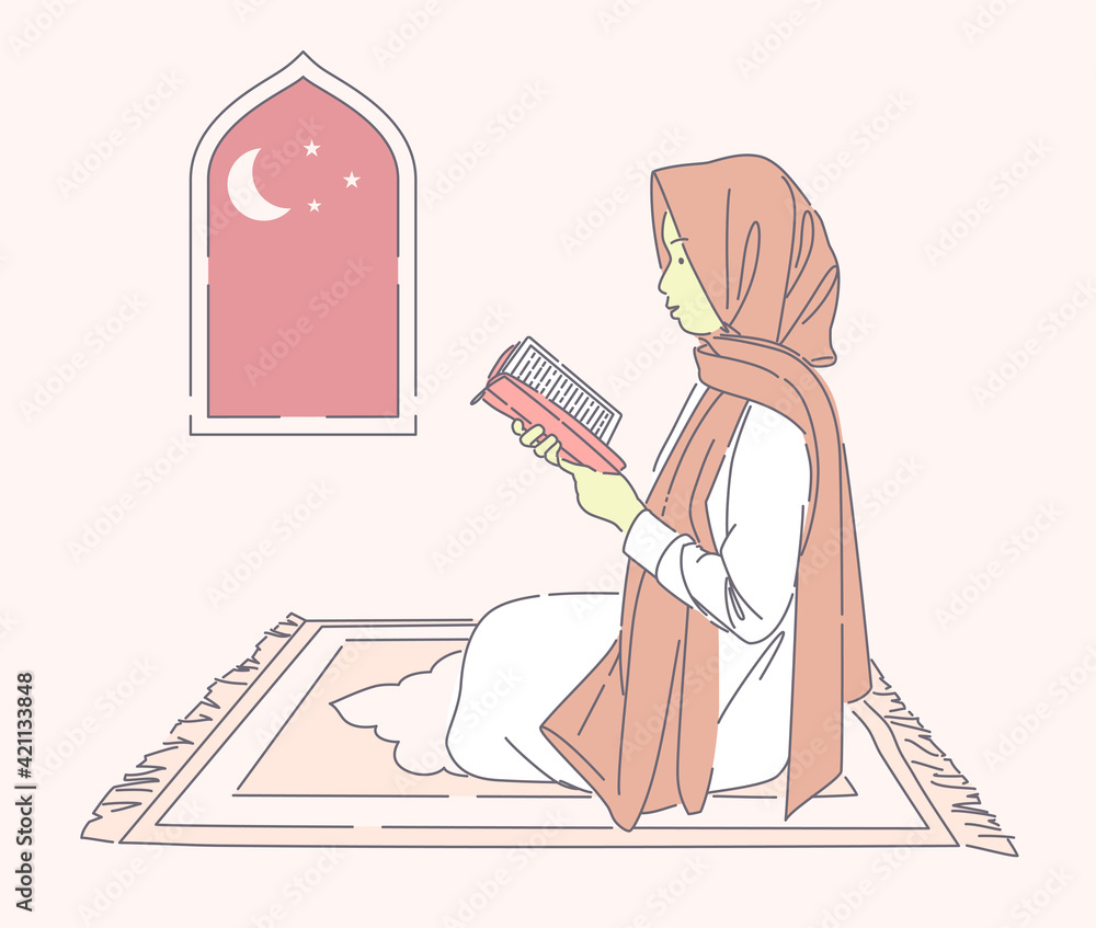 Stock Vektorgrafik beautiful muslim woman reading holy quran on praying mat vector hand drawn illustration happy girl wearing hijab praying at the night can use for landing page ui web poster banner f... Very well made.