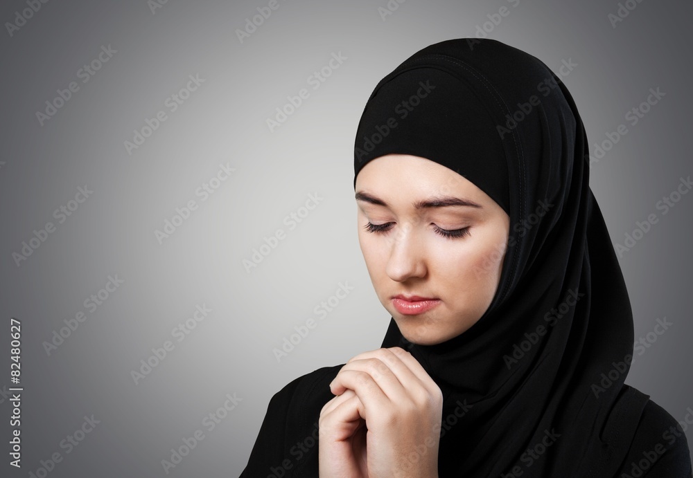Poster Wandbilder Islam. Muslim young woman wearing hijab on white 40x26.7 cm Very well made.