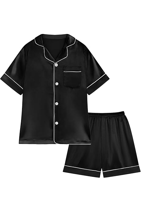 SWOMOG Unisex Kids Silk Pyjama Set Black 8 9 Years Soft Silky Sleepwear for Boys Girls Very well made.