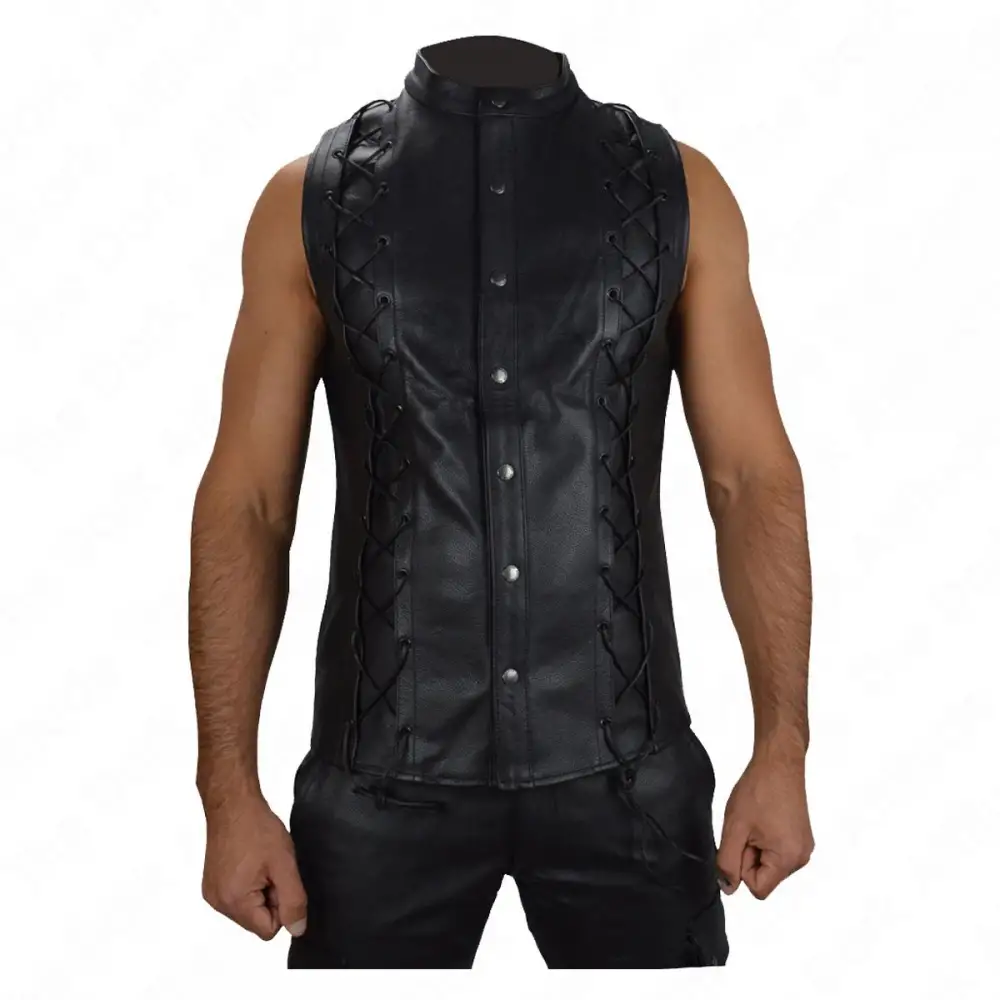 Mysterious Lace UP Black Biker Leather Vest Men s Very well made.