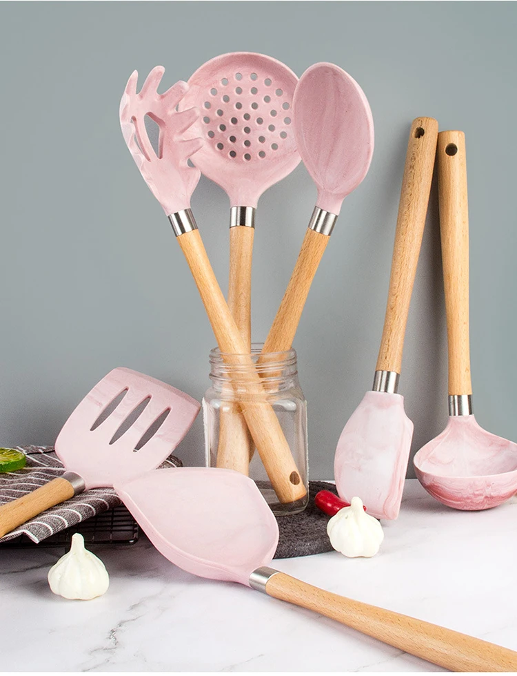 Non stick Heat Resistant 7 Pieces Kitchen Utensils Silicone Cooking Utensil Set with Wooden Handle Alibaba Very well made.