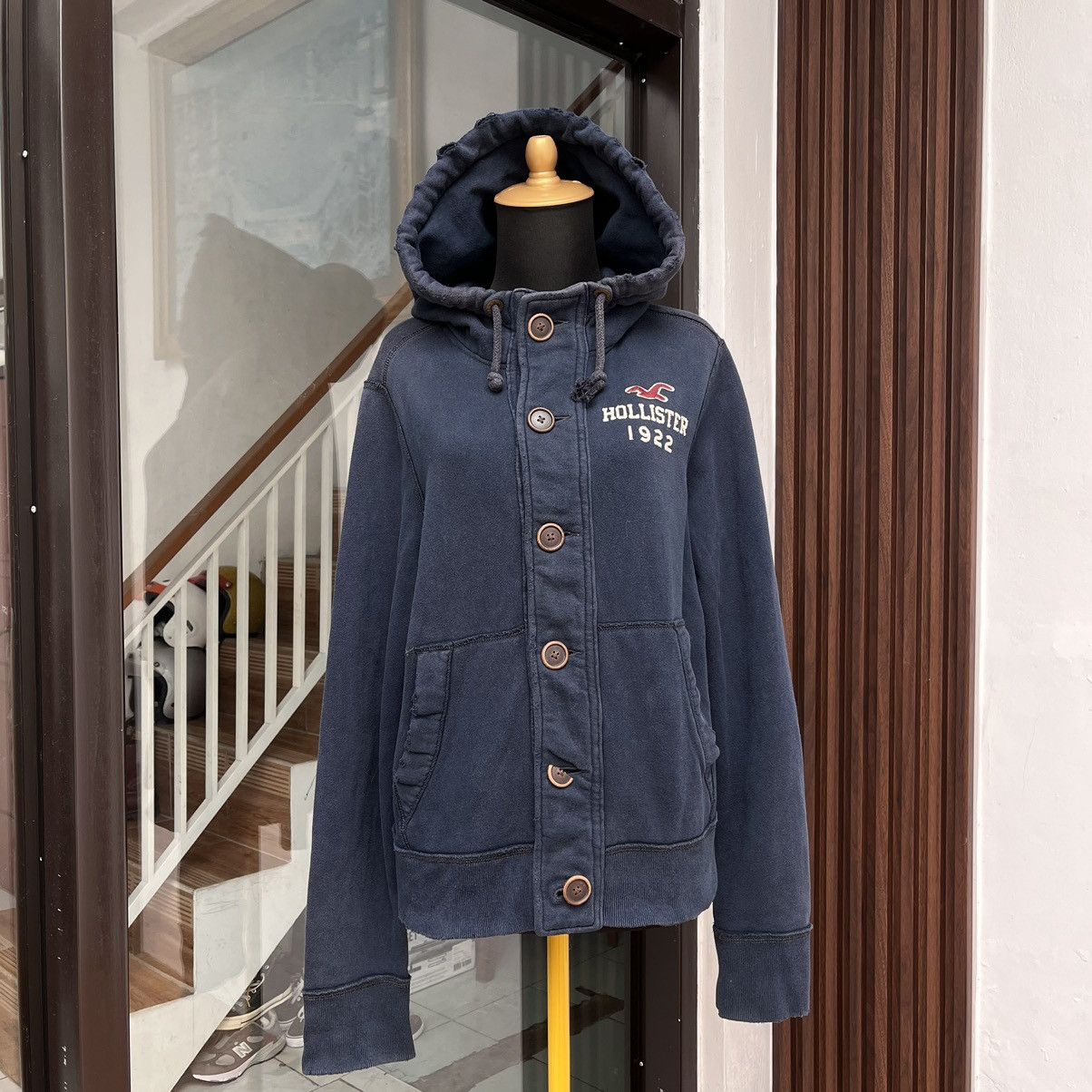 Hollister button up hoodie Fits a size s m Worn a Very well made.