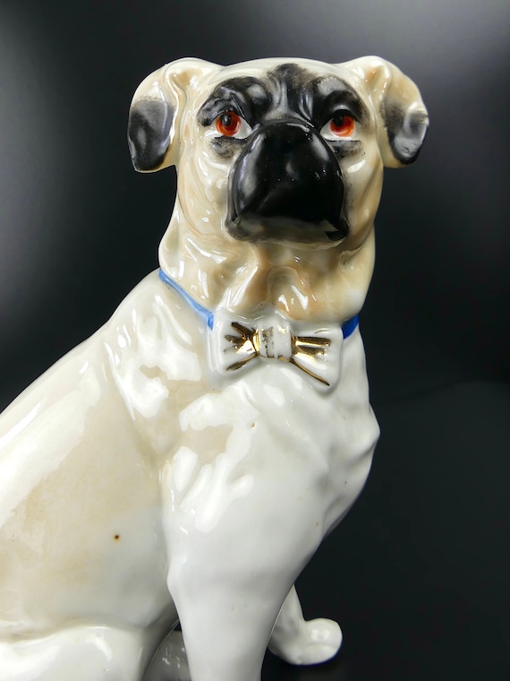 Pug in Porcelain Dog Sitting With Blue Collar and Golden Bow Tie Mid 20th Century Animal Porcelain Retro Decoration Quirky Curiosity Etsy Canada Very well made.