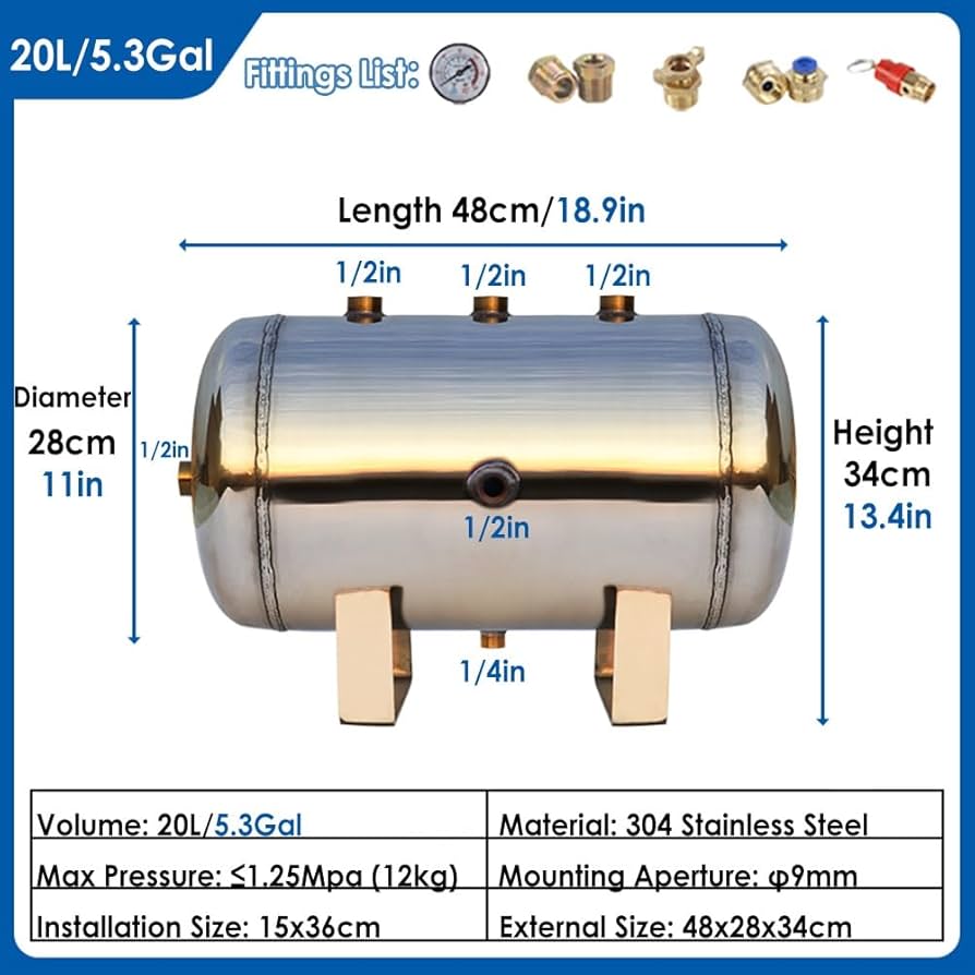 0.5L 1L 2L 5L 10L 20L 30L 40L 50L Portable Air Tank Stainless Steel High Pressure Reservoir Air Tank Kit Horizontal Air Storage Bladder Containers for Air Pump Gas Tank Compressor Size 5.3Gal Very well made.
