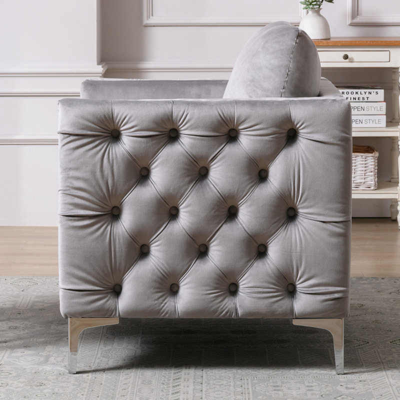 Avonlea Soft Grey Velvet Chair with Deep Rhinestone Tufting Silver Turned Feet Finally Home Furnishings LLC Very well made.