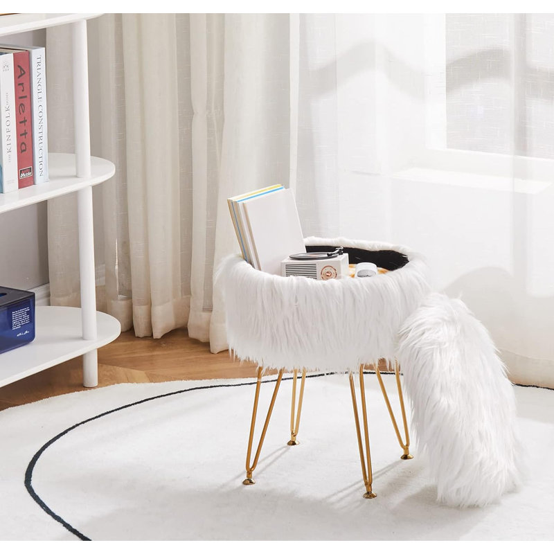 Vanity Stool Chair with Storage Ottoman Faux Fur Soft Padded Makeup Footstools Seat with 4 Metal Legs Anti Slip Gray Very well made.