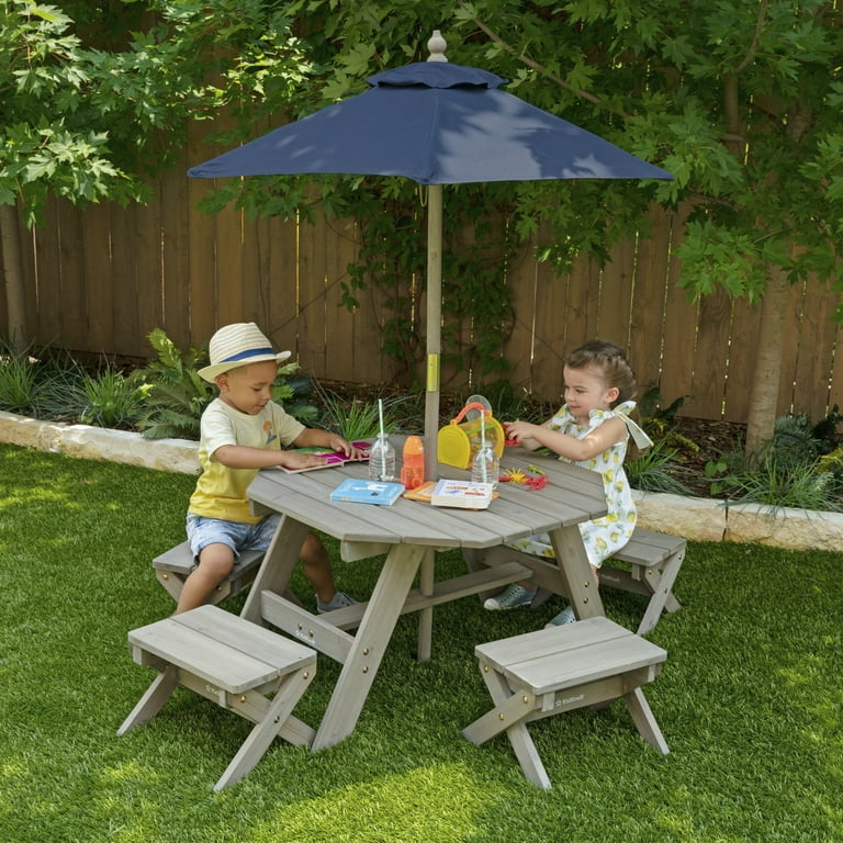 KidKraft Wooden Octagon Table Stools Umbrella Set Kids Outdoor Furniture Barnwood Gray Navy Very well made.