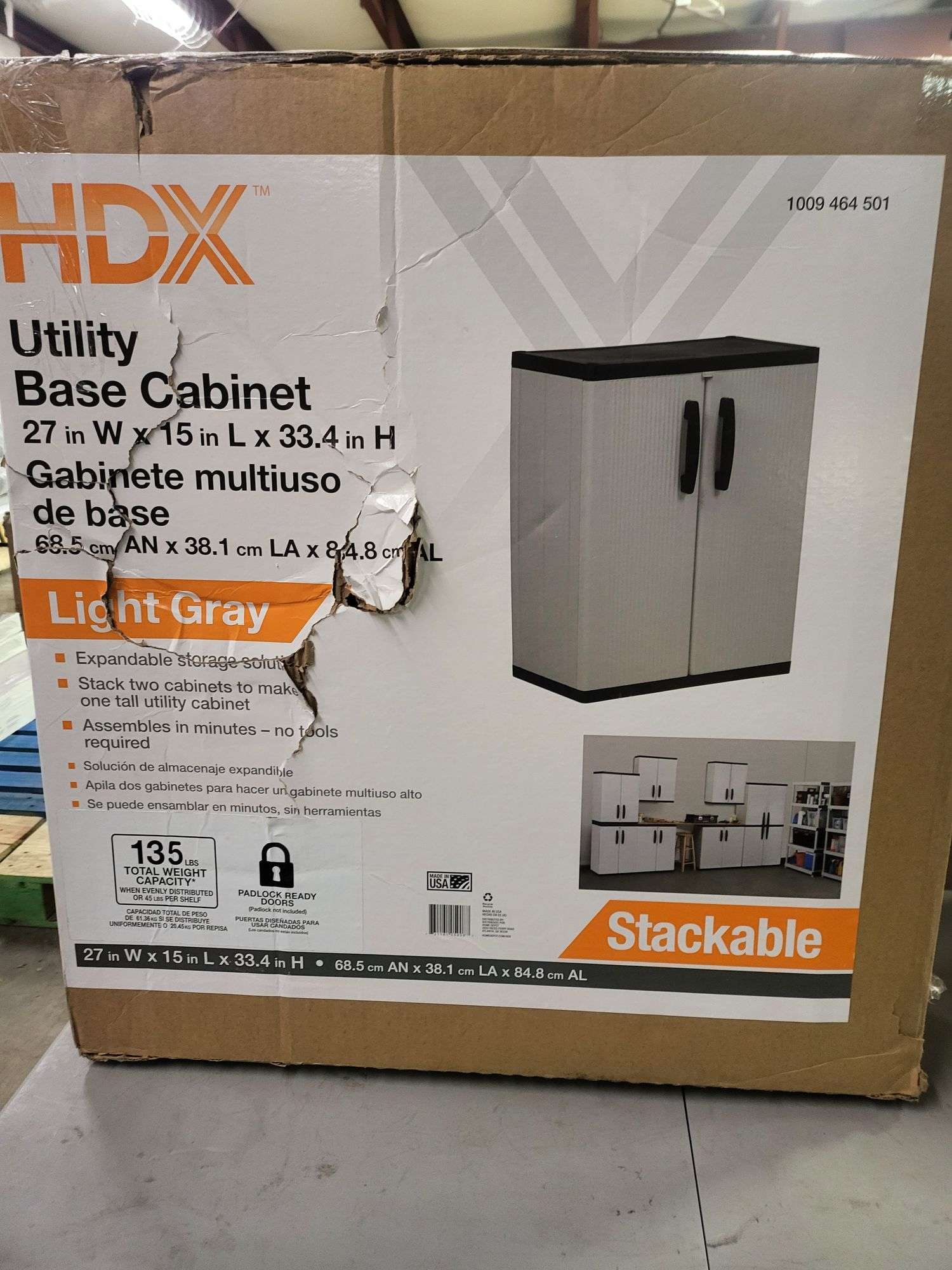 HDX Plastic Freestanding Garage Base Cabinet 27 in. W x 39 in. H x 15 in. D in Gray Matthews Auctioneers Very well made.