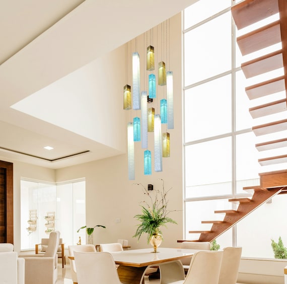 High Ceiling Lighting. Staircase Lighting. A Combination of Extra Long and Standard Fused Glass Pendants. Customizable Etsy UK Very well made.