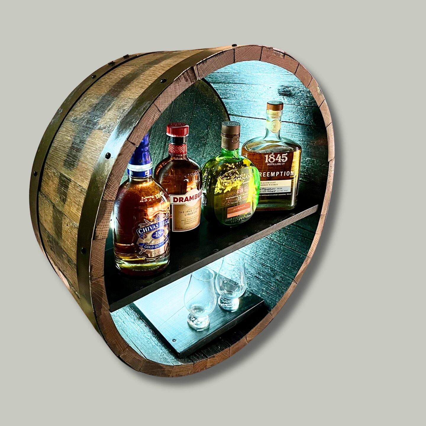 Whiskey Barrel Liquor Display to Showcase your collection Rustic Elegance from Illuminated Handcrafted Cabinet using Genuine Bourbon barrel MakerPlace by Michaels Very well made.