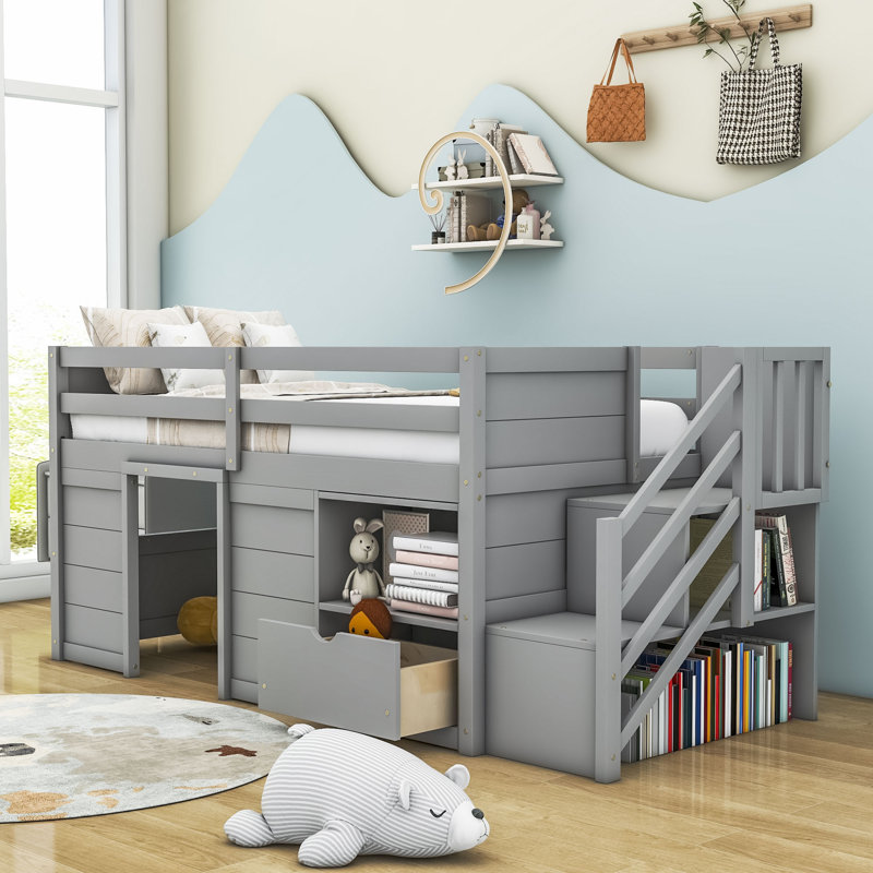 Jacquece Twin Size Wood Loft Bed with Drawer Shelves and Staircase Harriet Bee Color Gray Very well made.
