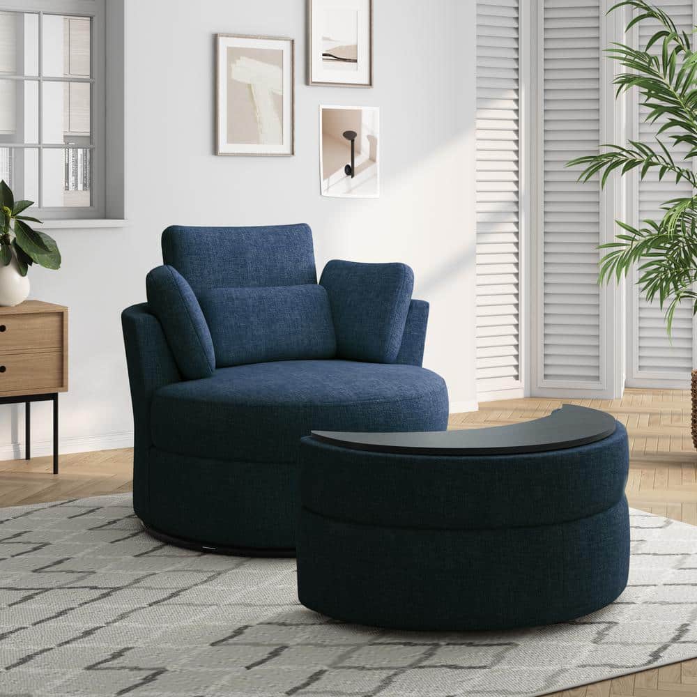 Navy Blue Chenille Upholstered Swivel Accent Barrel Chair with Storage Ottoman and Pillows Set of 1 Very well made.