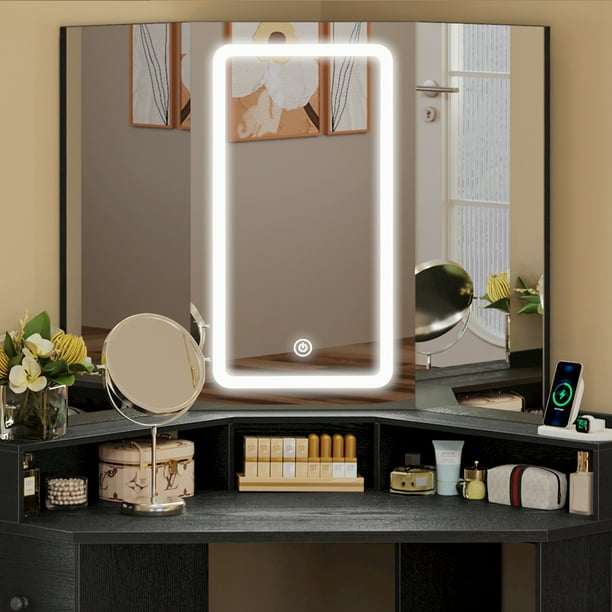 IRONCK Corner Vanity Desk Set with 3 Folding Lighted Mirror Charging Station 7 Storage Shelves and Storage Bench for Bedroom Black Walmart Business Supplies Very well made.