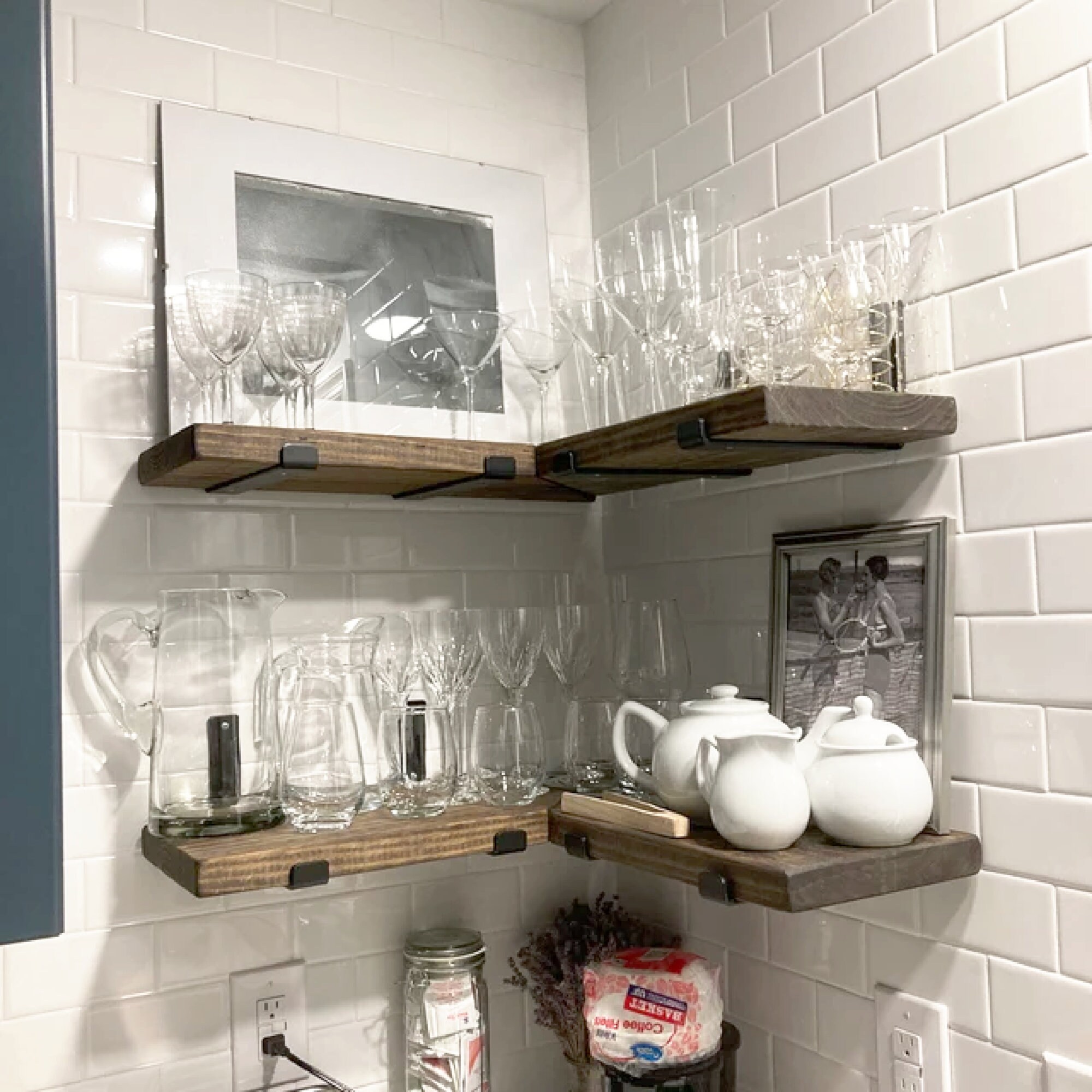 One 11.25 Depth Fixer Upper Farmhouse Floating CORNER Shelf With 2 Each J Shaped Brackets. Etsy Very well made.