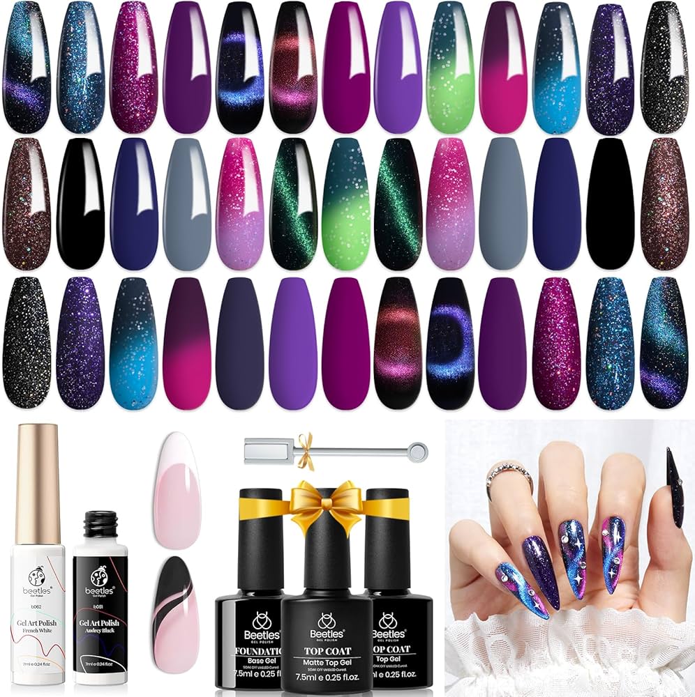 beetles Gel Polish Nail Art Gel Liner Set 2 Popular Black White Colors with 24Pcs Gel Nail Polish Kit 20 Color Changing Cat Eyes Gilitter Colors Gel Very well made.