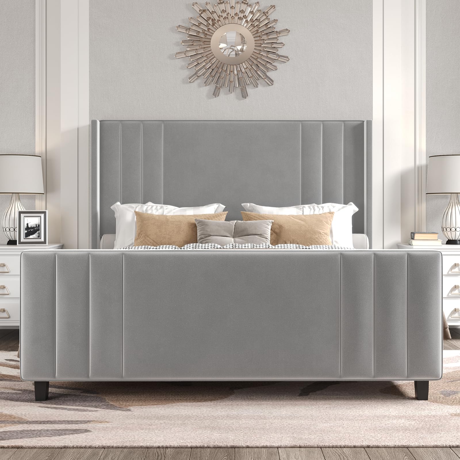 Amazon Albott King Size Platform Bed Frame Upholstered Bed with Vertical Channel Tufted Wingback Headboard Footboard Premium Velvet No Box Spring Needed Light Grey Home Kitchen Very well made.