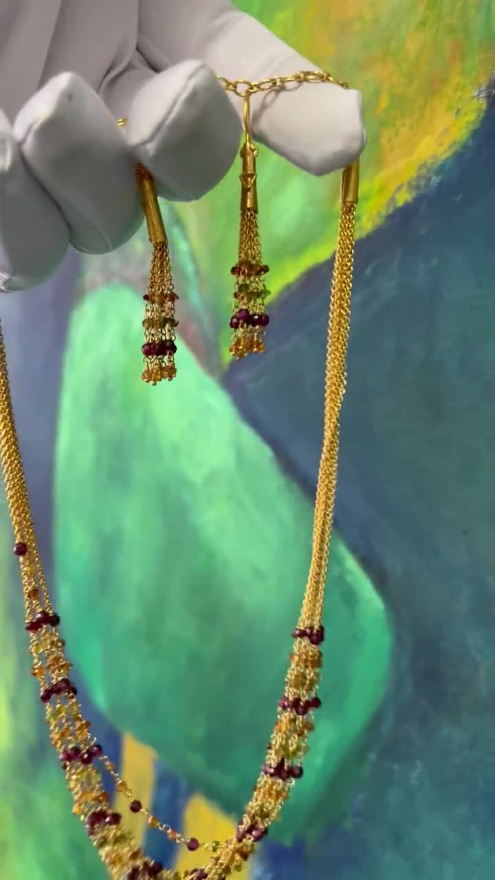 Modern Tanishq 22k Gold 31.31 Gram Necklace Earring Set Natural Colored Garnet Very well made.