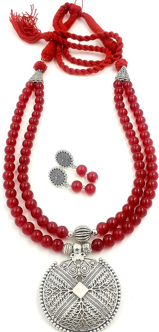 Sreevee Handmade German Silver Oxidised Pendant with Maroon Beads dori Necklace and Matching Dangle Earring Jewellery Set For Women Amazon.in Very well made.