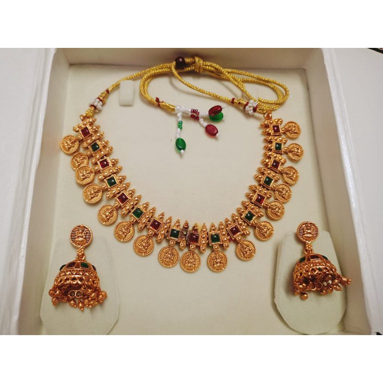 Ruby Gemstone Long Haram Antique Gold matte Finish South Indian Jewelry Choker Set Southindian Gold jewelry set Indian God Laxmi Necklace Very well made.