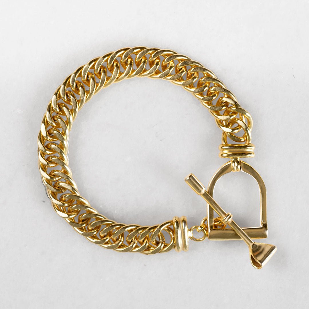 T Bar Curb Chain Stirrup Buckle Clasp 14K Gold Plated Brass Bracelet Very well made.