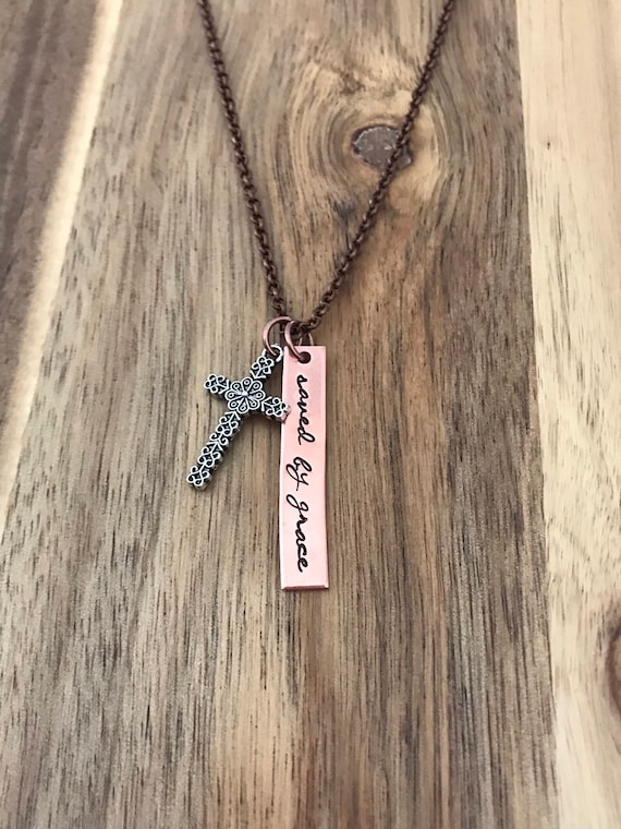 Ephesians 2 8 9 Necklace Saved by Grace Christian Jewelry Cross Baptism Gift Cursive Script Scripture Bible Verse Hand Stamped Very well made.