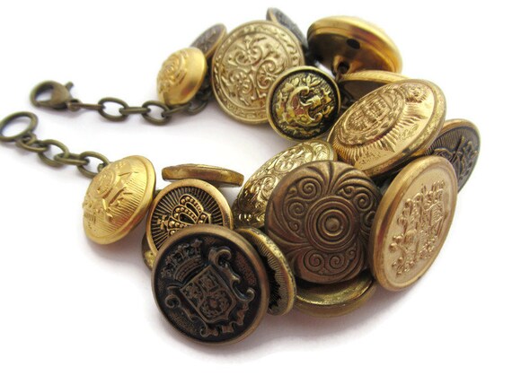 Antique Button Charm Bracelet Gold Bracelet Brass Button Bracelet Vintage Button Jewelry Recycled Buttons Brass Boho Bracelet Very well made.