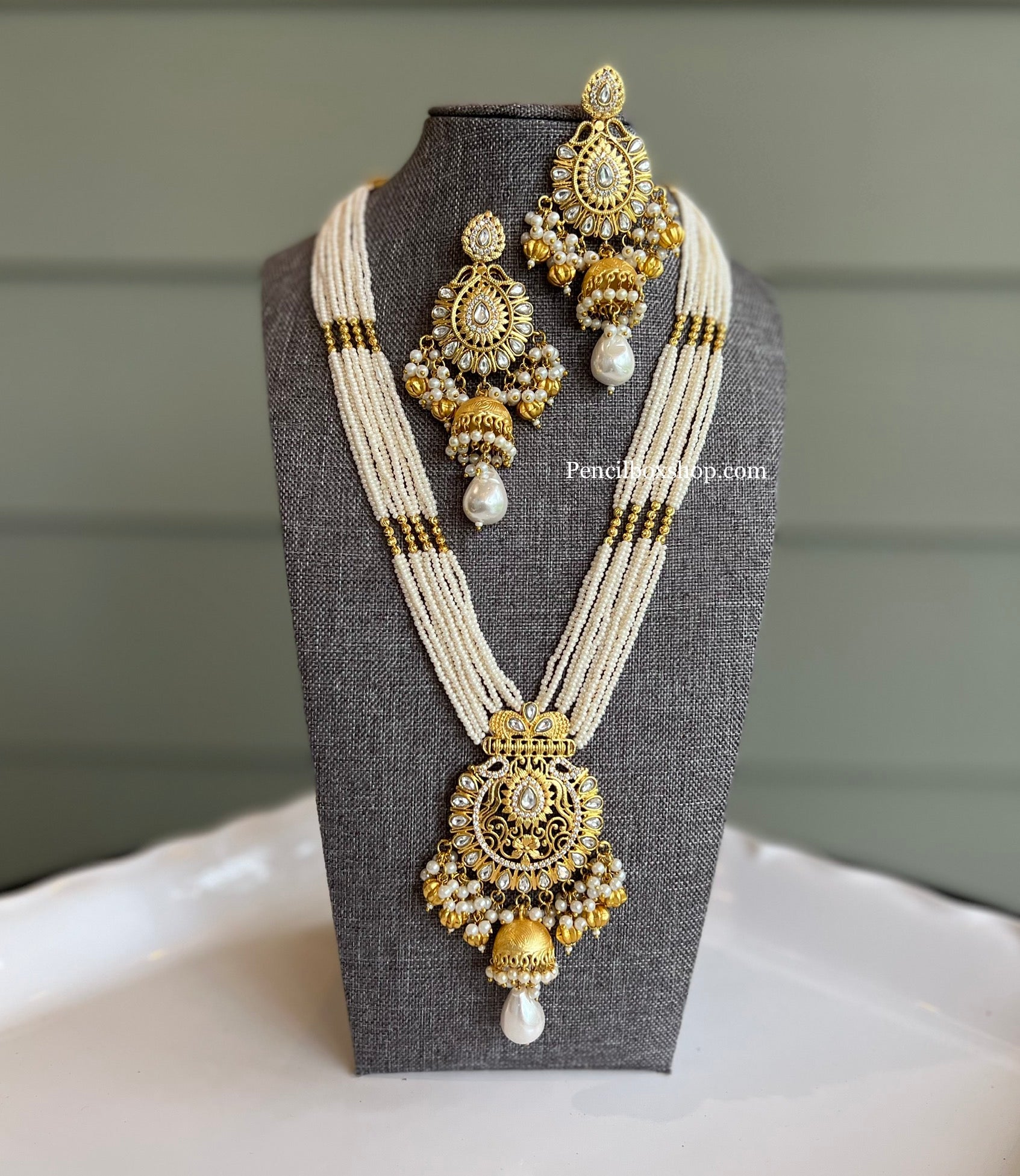 White Pearl Golden Beads long Kundan Statement Necklace set Very well made.