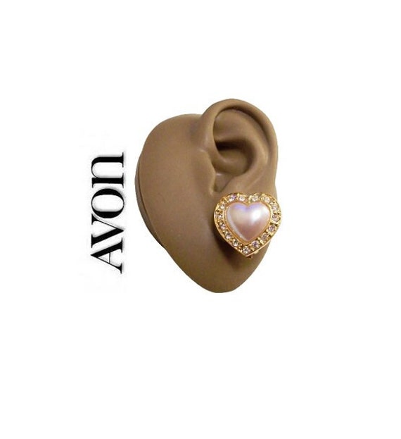 PrettyVintiqueJewels Avon Pearl Crystal Heart Clip On Earrings Gold Tone Vintage Large White Domed Center Bead Round Clear Accent Wide Edge Stones Nail Heads Very well made.