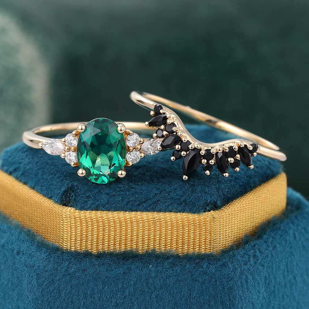 Unique Oval Emerald Engagement Ring Set Cluster Bridal Set Black Onyx Ring Curved Band Yellow Gold Very well made.