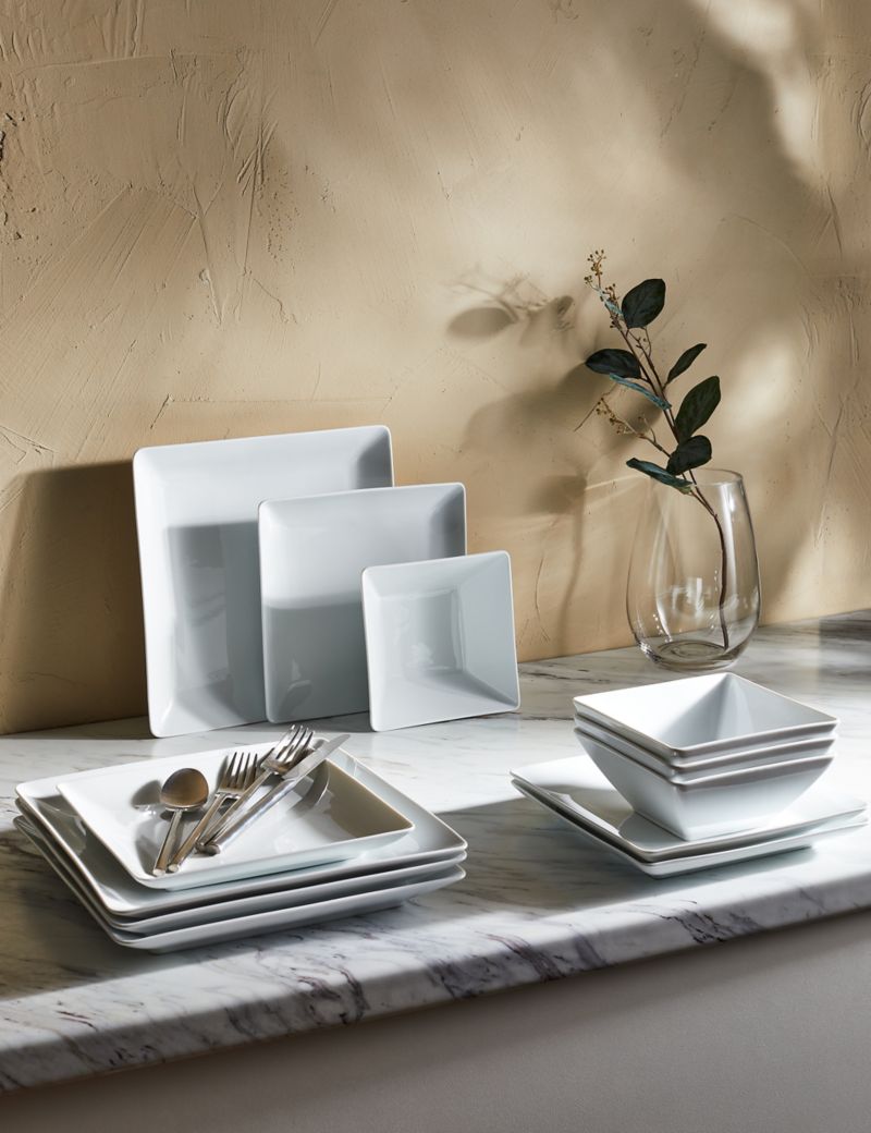 Amazon DOMINI 12 Piece Ceramic Kitchen Dinnerware Set Service for 4 Porcelain Dishes Dinner Set Square Dinnerware Sets with Dinner Plates Dessert Plates and Pasta Bowls Square White Dinnerware Set... Very well made.