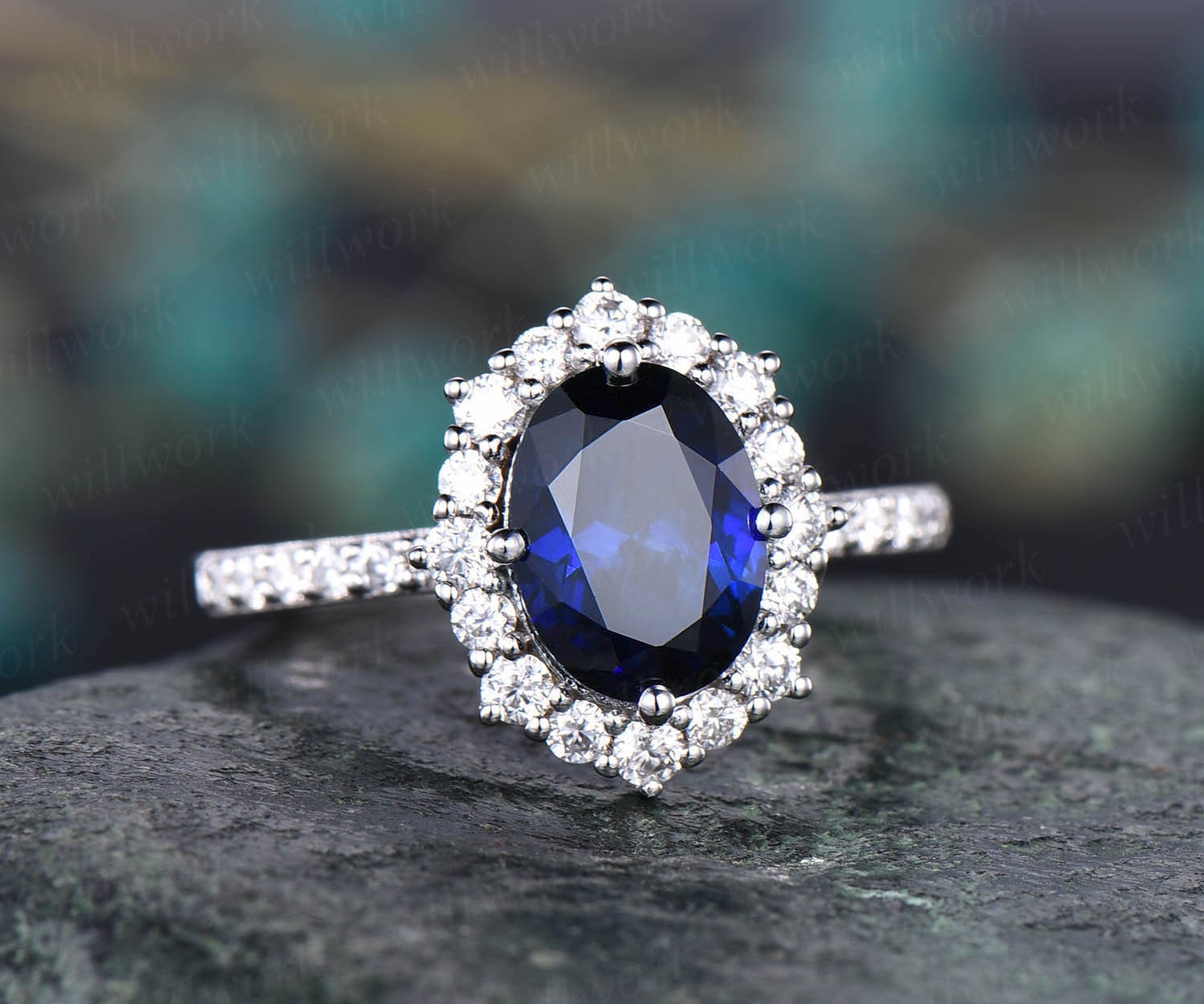 6x8mm Oval Cut Blue Sapphire Engagement Ring White Rose Gold Moissanite Halo Vintage for Women Her Vintage Antique Bridal Wedding Ring Band 18K Yellow Very well made.