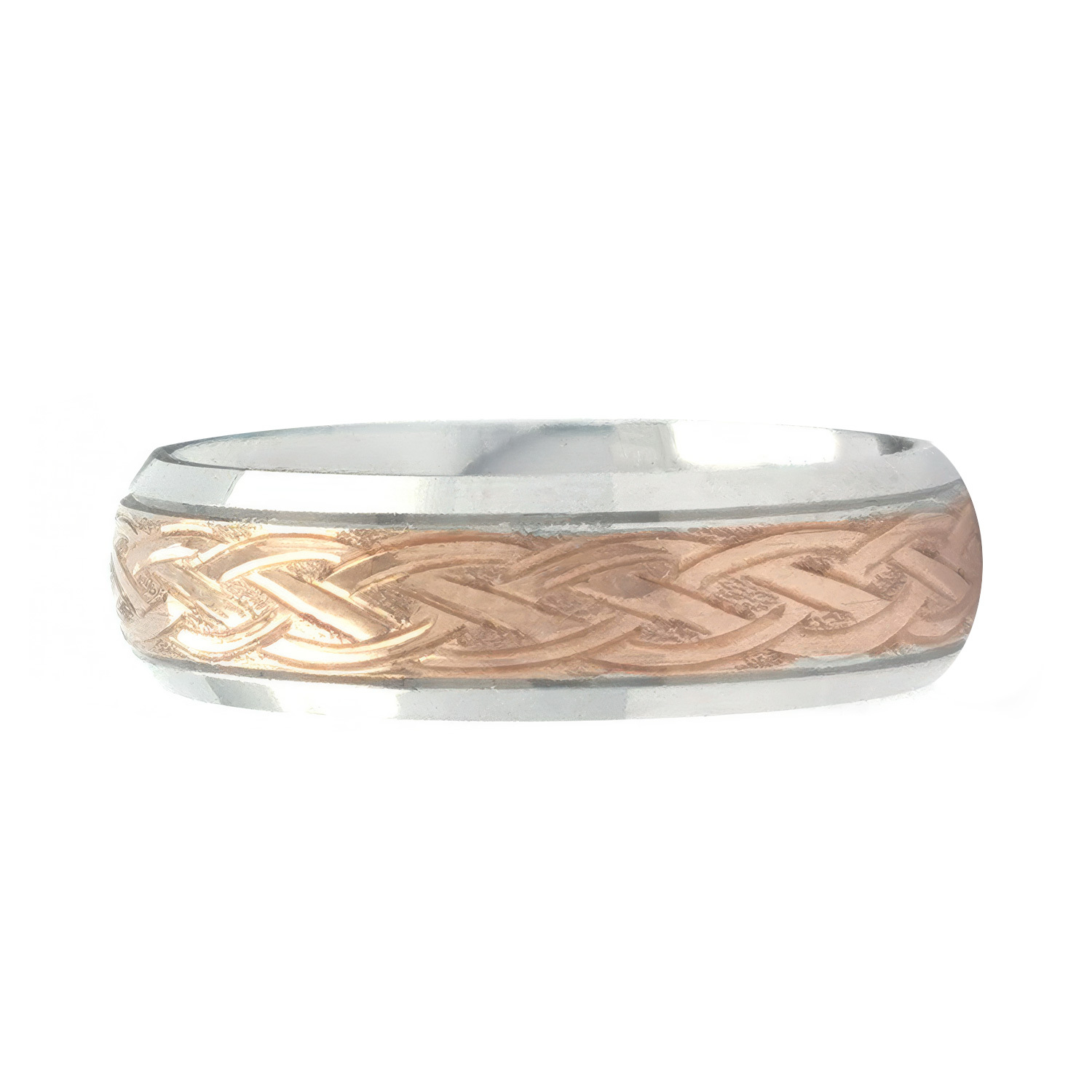 Platinum Rose Gold Celtic Knot Wedding Ring unisex Authentic Platinum Rose Gold Sizes 4 to 13.5 6.0 mm Band Engravable Gift Box Very well made.
