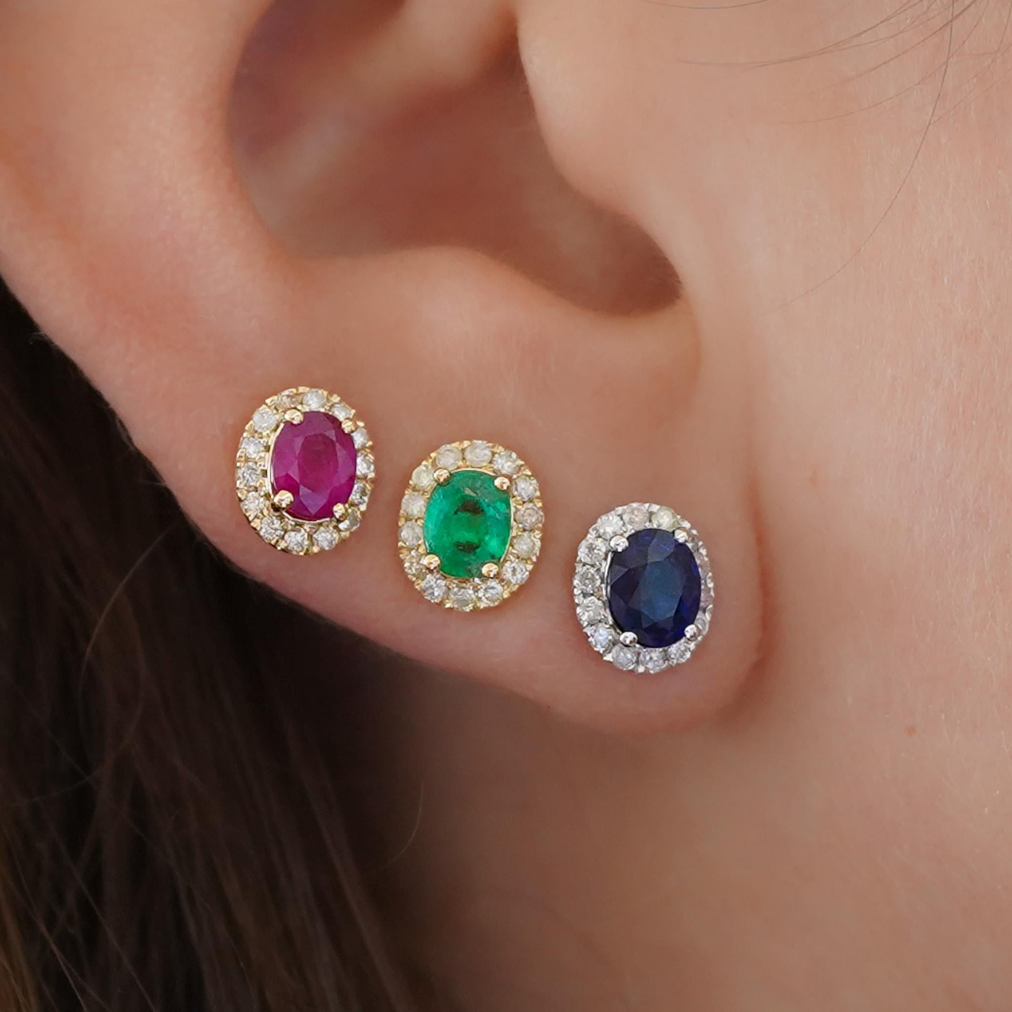 Emerald Ruby Or Sapphire Diamond Halo 1 Carat Stud Earrings in 14K Gold Very well made.