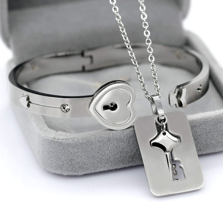Engraved Lock and Key Bracelet Pendant Necklace Set for Couples Gullei Very well made.