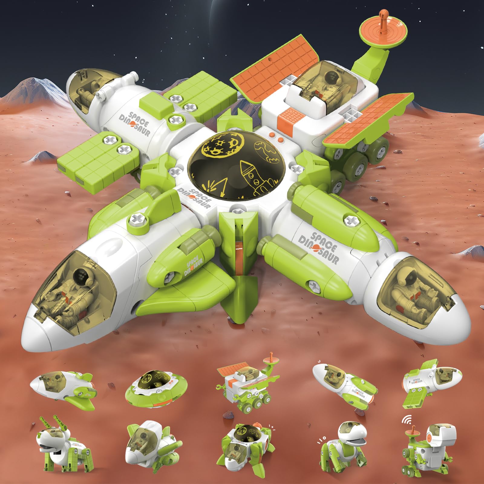 Fistone Space Toys and Dinosaur Toys 10 in 1 Transforming Set with Space Shuttle Flying Saucer Satellite Space Rover Rocket and Dinosaur Toys Very well made.