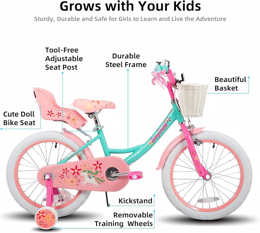 JOYSTAR Unicorn 18 Inch Girls Bike for 5 9 Years Old Kids 18 Inch Kids Bike with Stabilisers Doll Seat Pink Basket Green Amazon Sports Outdoors Very well made.